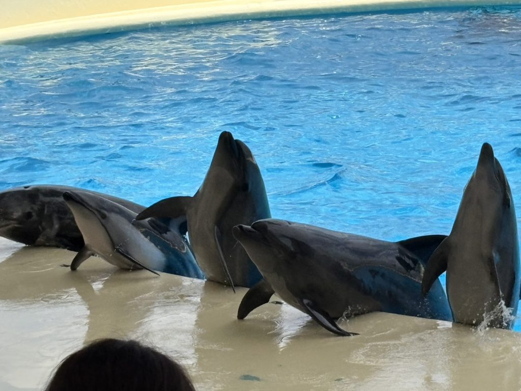 その後イルカたちの紹介に入るのですが、まさか前方席のステージ近くで身を乗り出してくれるなんて思わんやん!!!!ぶちかわええやんけ!!!!!!!とその時すぐさまスマホで動画撮影しましたが画質に泣😢