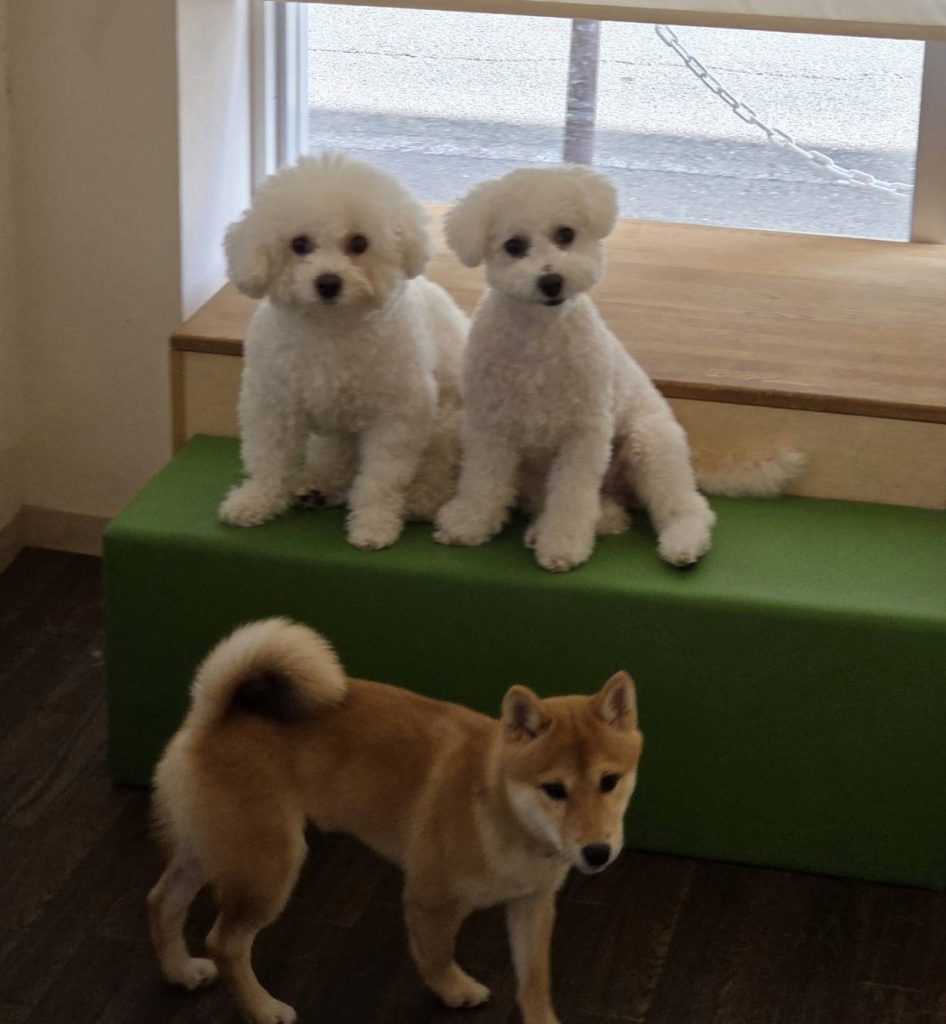 寄り添うように座っているビションちゃんたちは、いつも寝転がりながらじゃれ合ったり
